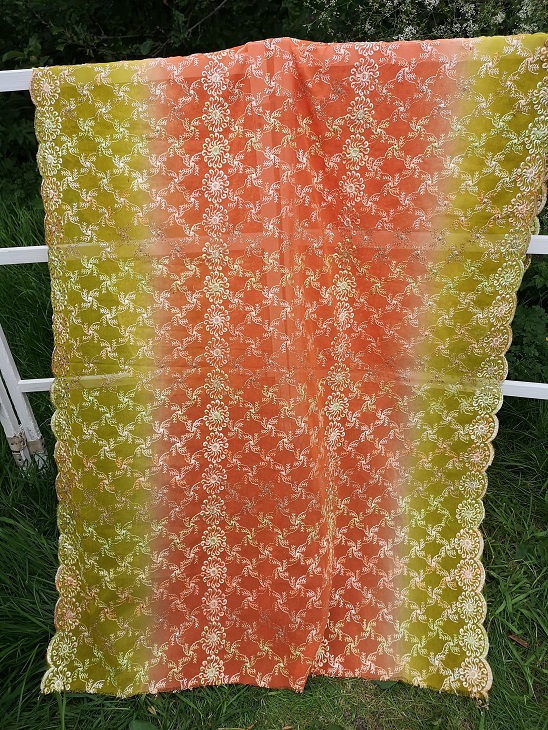 This lime green and orange dupatta / scarf is made of Georgette and is decorated with pastel coloured embroidery with stylised flower circles along the edge.