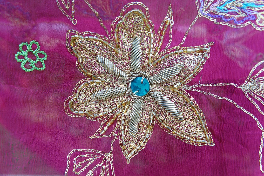 This bright pink dupatta / scarf is made of Georgette and is highly decorated with cream and gold embroidery all over. It has a deep border with embroidered flowers and leaves.